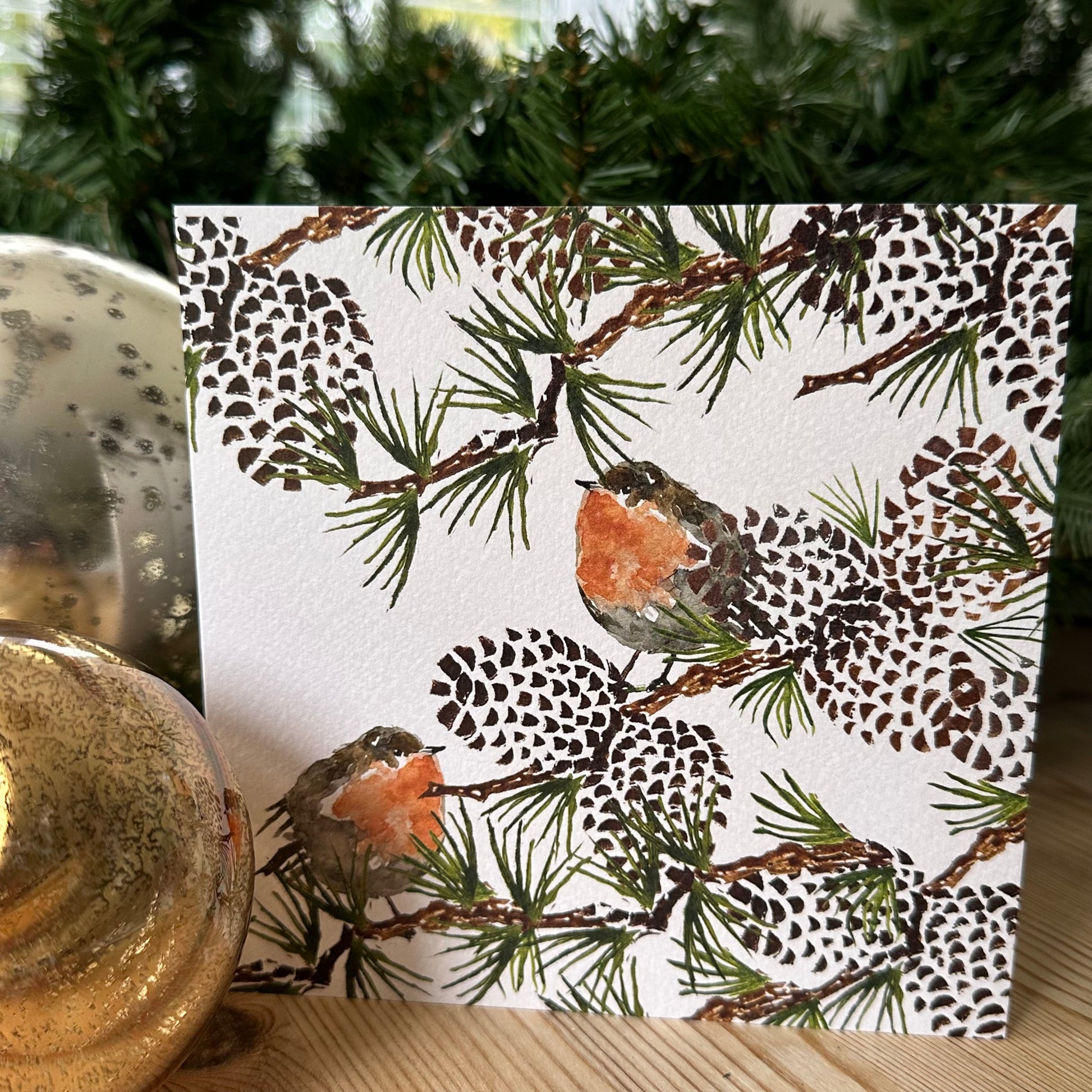 Robins & Pinecones - Hand-Drawn Christmas Card