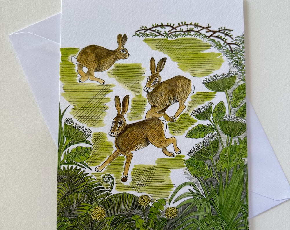 The Frolicking Hares print greeting card is perfect for any occasion! Printed on high quality 280 gsm card stock with a beautiful matte finish, the 18cm x 13cm card is blank inside for your personal message and comes with a white envelope and eco-friendly wrap.